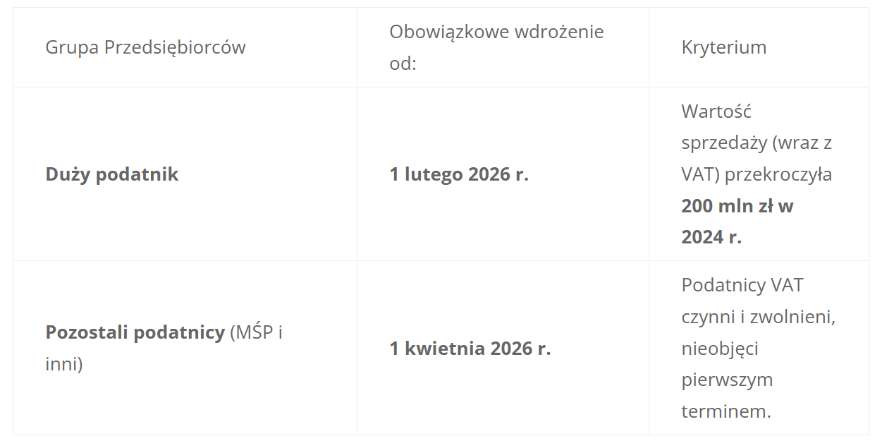 - Termin wejścia w życie dla dużych podatników: 1 lutego 2026 r., pozostali podatnicy: 1 kwietnia 2026 r.